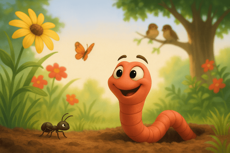In einem kleinen Garten, umgeben von bunten Blumen und großen, schattenspendenden Bäumen, lebte ein kleiner Regenwurm namens Wolli. Wolli war ein neugieriger Regenwurm, der seine Tage damit verbrachte, sich durch die dunkle, feuchte Erde zu schlängeln. Er mochte das Gefühl der Erde zwischen seinen Segmenten und genoss die kühle Dunkelheit seiner unterirdischen Heimat. Doch tief in seinem Inneren hegte Wolli einen besonderen Wunsch: Er wollte den Herbst von oben bestaunen und die bunten Farben der Blätter sehen, die er nur von den Erzählungen der anderen Tiere kannte.