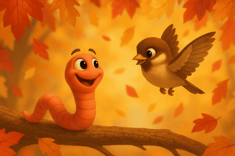 Eingabe Geschichtenpilot: Ein Regenwurm möchte nicht immer in der Erde stecken, sondern den Herbst von oben bestaunen.